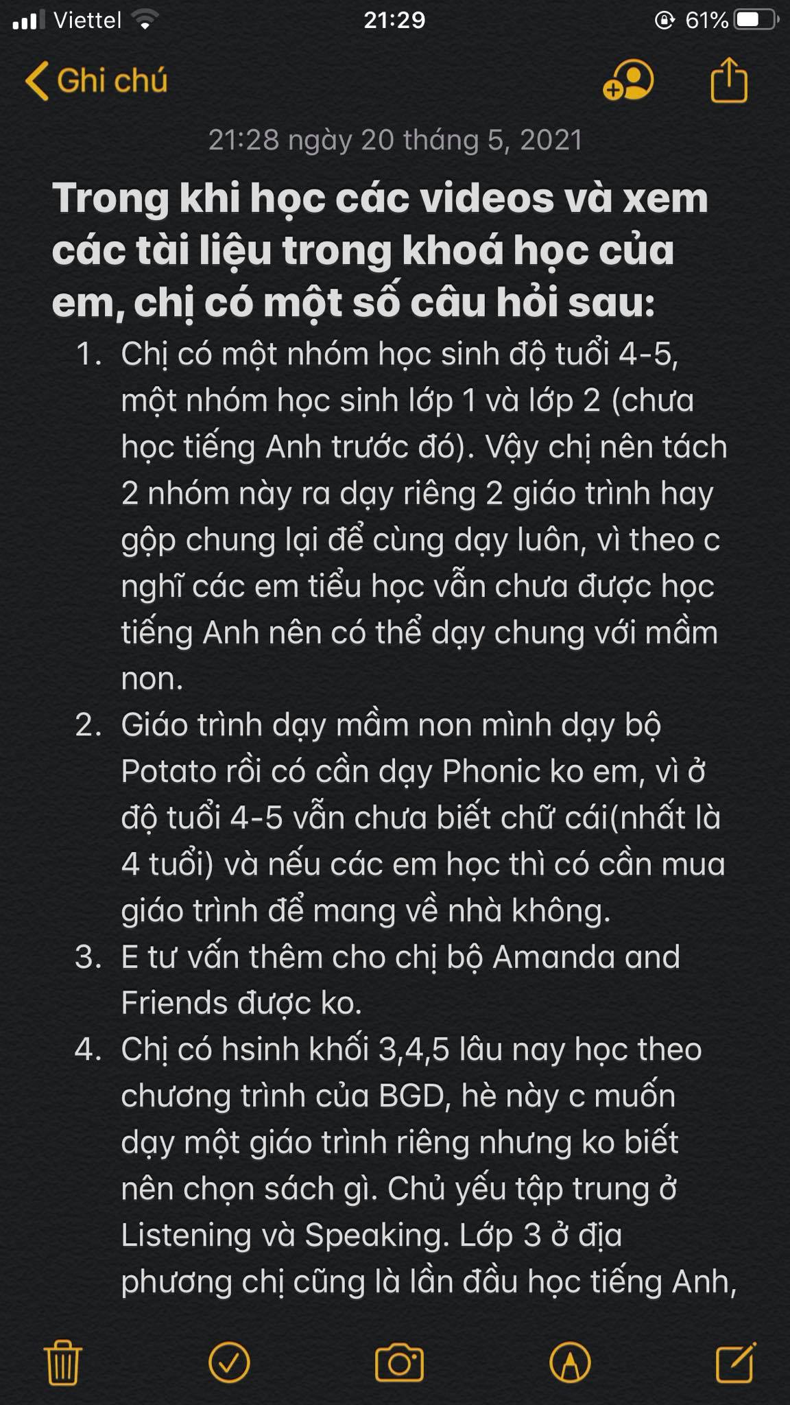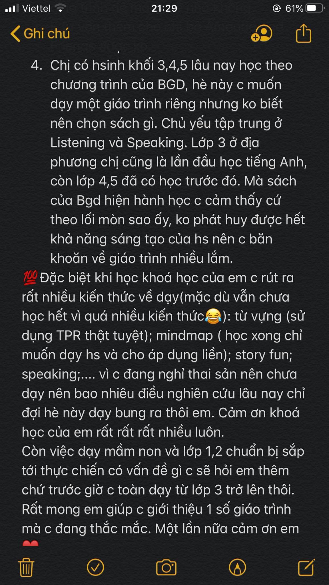 Tính đến nay là tròn 9 tháng em làm khoá đào tạo gvta online này. Lúc em mới ra mắt sản phẩm, mọi người đăng kí học rất rất nhiều, thậm chí là em chưa hoàn thiện sp 100% mà đã có quý thầy cô chuyển khoản cho em rồi. Trải qua những tháng đó cho tới bây giờ, khoá học đã cập nhật hơn rất nhiều. Em biết ơn vô cùng tới các chị đã mua khoá của em từ những ngày đầu tiên cho tới bây giờ. Nhiều ng bảo em, sao cô bán khoá này rẻ thế, bao nhiêu tài liệu chất xám của cô mà cứ như tặng ý. Nói thật vs m,n là em k phải là ng bán tài liệu, mà em mong muốn là giúp đỡ dk nhiều gv giảng dạy tốt hơn, tài liệu em tặng m,n thì em sẽ phải hướng dẫn m,n khai thách triệt để dk tài liệu đó. Vì nhiều gv có rất nhiều tài liệu nhưng m,n k biết cách thì phí vô cùng.