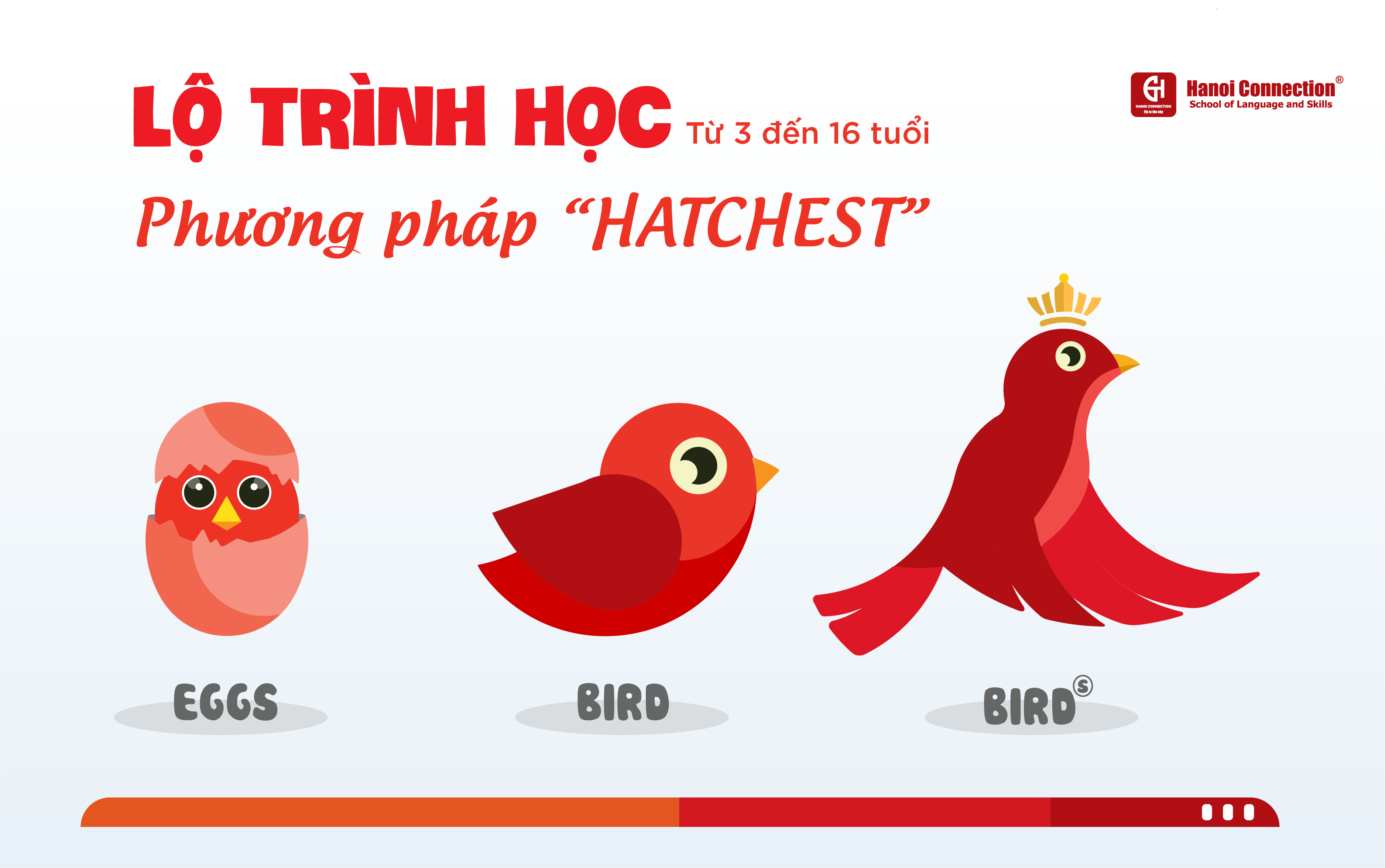 Lấy cảm hứng từ việc kết hợp từ Nest (làm tổ) - Hatch (ấp trứng) Hanoi Connection xây dựng lên phương pháp học Tiếng Anh HATCHEST dành cho các bé từ 3 tuổi.